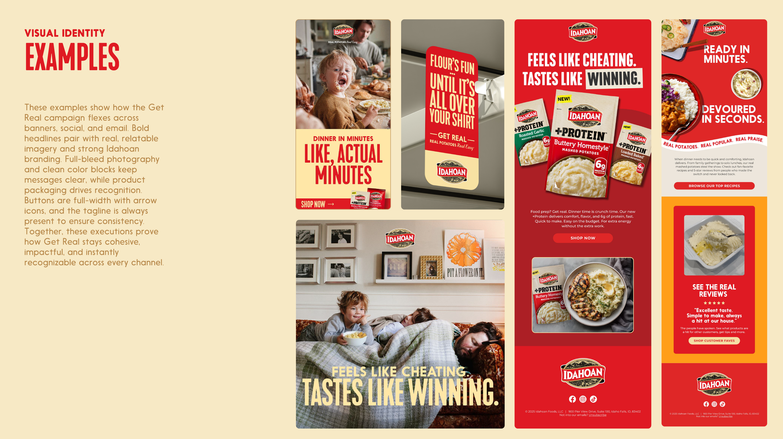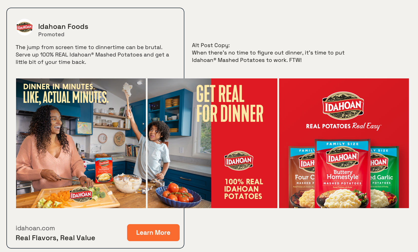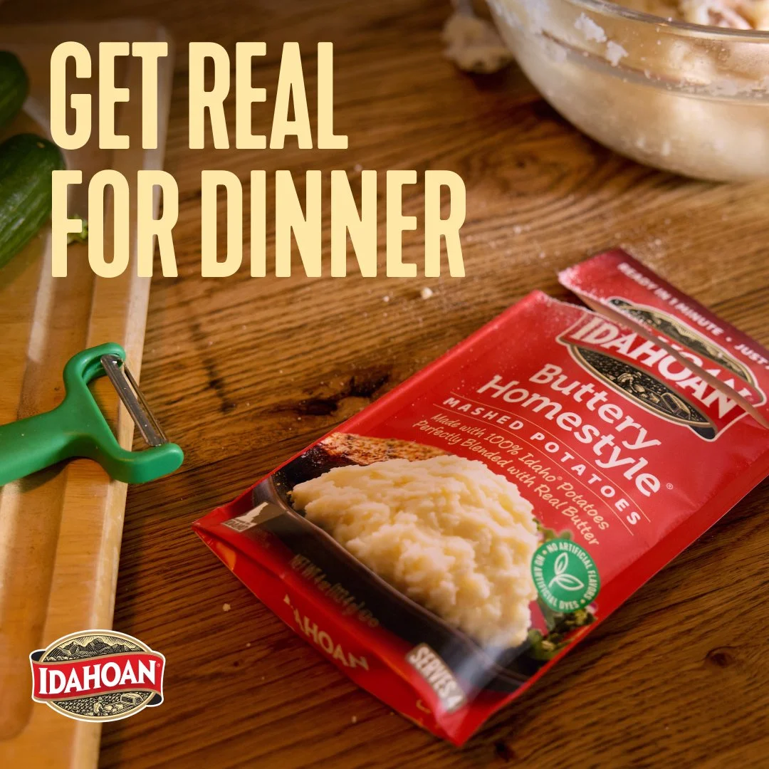 Idahoan had been a social media client for over a year. We were able to pitch and win full digital marketing services across the brand for 2026. A pain point of Idaohan is consumers believe the product is not real potatoes. Our first goal was to present a new brand campaign that focused on the products coming from real potatoes and highlighted the real people making dinner. We took the profection and aspiration out of the ads, and delivered a campaign consumers can relate to.